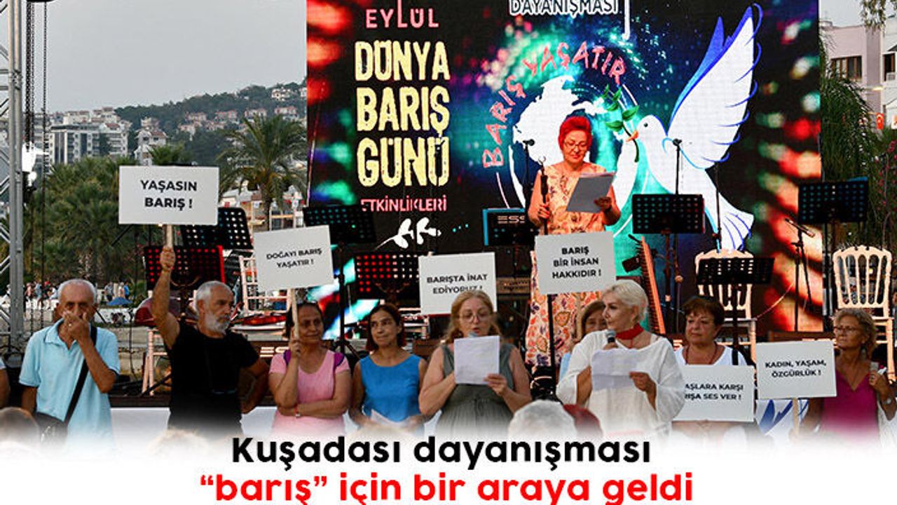 Kuşadası Dayanışması üyesi kadınlar, 1 Eylül Dünya Barış Günü nedeniyle İsmail Cem Dostluk ve Barış Meydanı’nda bir araya geldi. Şiir dinletisi ve dans gösterileriyle renklenen etkinlikte barış mesajları verildi. Etkinliğe Ukraynalı kadın ve çocuklar da katıldı.