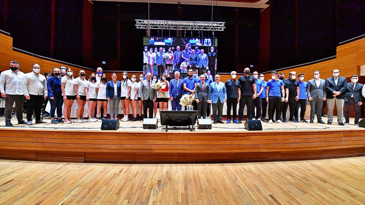 İzmir Büyükşehir Belediye Meclisi’nin Haziran ayı olağan toplantısının ikinci oturumu Ahmed Adnan Saygun Sanat Merkezi’nde yapıldı. İzmir Büyükşehir Belediye Başkan Vekili Mustafa Özuslu yönetimindeki oturumda Türkiye Kupası’nı kazanan İzmir Büyükşehir Belediyesi Erkek Hentbol Takımı ile aynı kupada finale kalan Kadın Hentbol Takımı’na plaketleri verildi. Sahnede hentbolcular, parti grup başkan vekilleri ve sözcüleri ile hatıra fotoğrafı çektirdi.