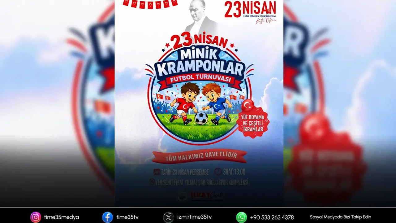 Menderes Belediyesi 23 Nisan Ulusal Egemenlik ve Çocuk Bayramı coşkusunu çocuklarla yeşil sahalara taşıyor. Menderes’te yer alan amatör spor kulüplerinin 2017 - 18 - 19 doğumlu minik takımlarının yer alacağı 23 Nisan Minik Kramponlar Futbol Turnuvası ulusal bayramla aynı gün Şehit Fırat Yılmaz Çakıroğlu Spor Kompleksi’nde düzenlenecek. Saat 13:00’da başlayacak olan spor etkinliğinde çocuklar için yüz boyama standı da yer alacak.