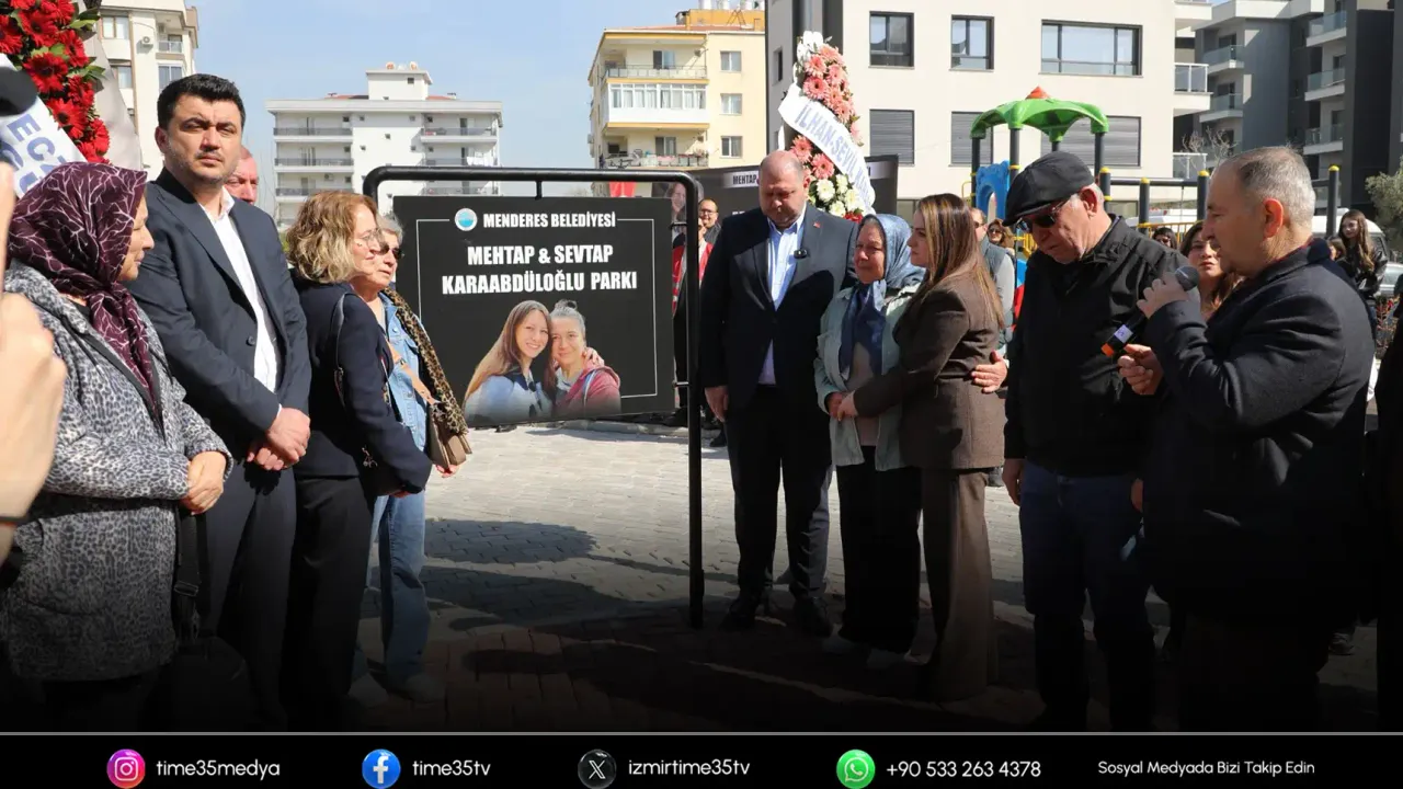 Menderes Belediyesi’nin 6 Şubat depremlerinde hayatını kaybeden Menderesli kardeşler Mehtap Karaabdüloğlu ve Sevtap Karaabdüloğlu’nun yanı sıra tüm deprem kayıplarımızı andığı Kasımpaşa Mahallesi’ndeki yeni park açıldı. Mehtap ve Sevtap Karaabdüloğlu adını alan parkın açılışını Menderes Belediye Başkanı İlkay Çiçek, Eşi Melek Çiçek, CHP İlçe Başkanı Mehmet Emin Işık ile depremde vefat eden kardeşlerin annesi Sevil Karaabdüloğlu ve babası İlhan Karaabdüloğlu yaptı.