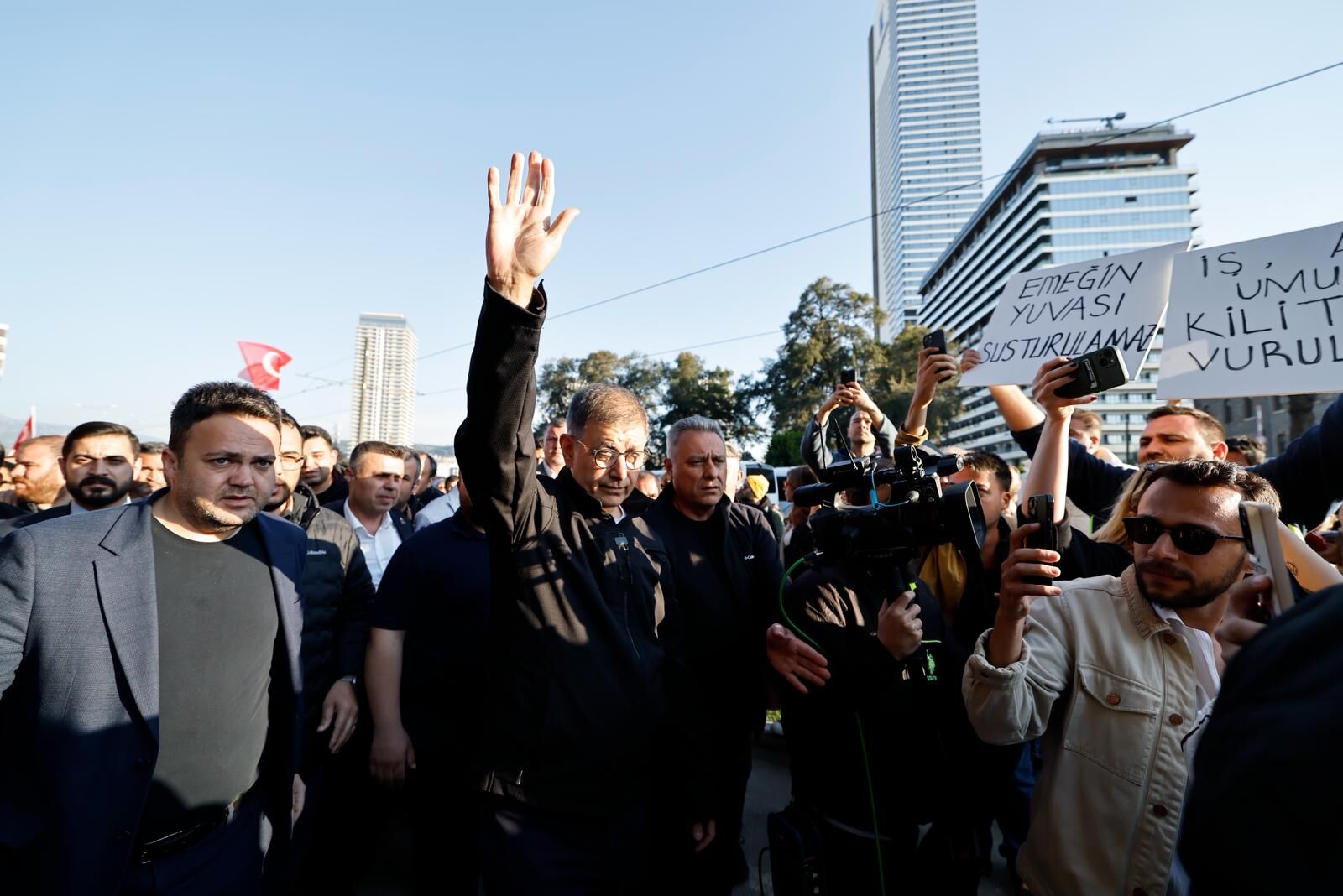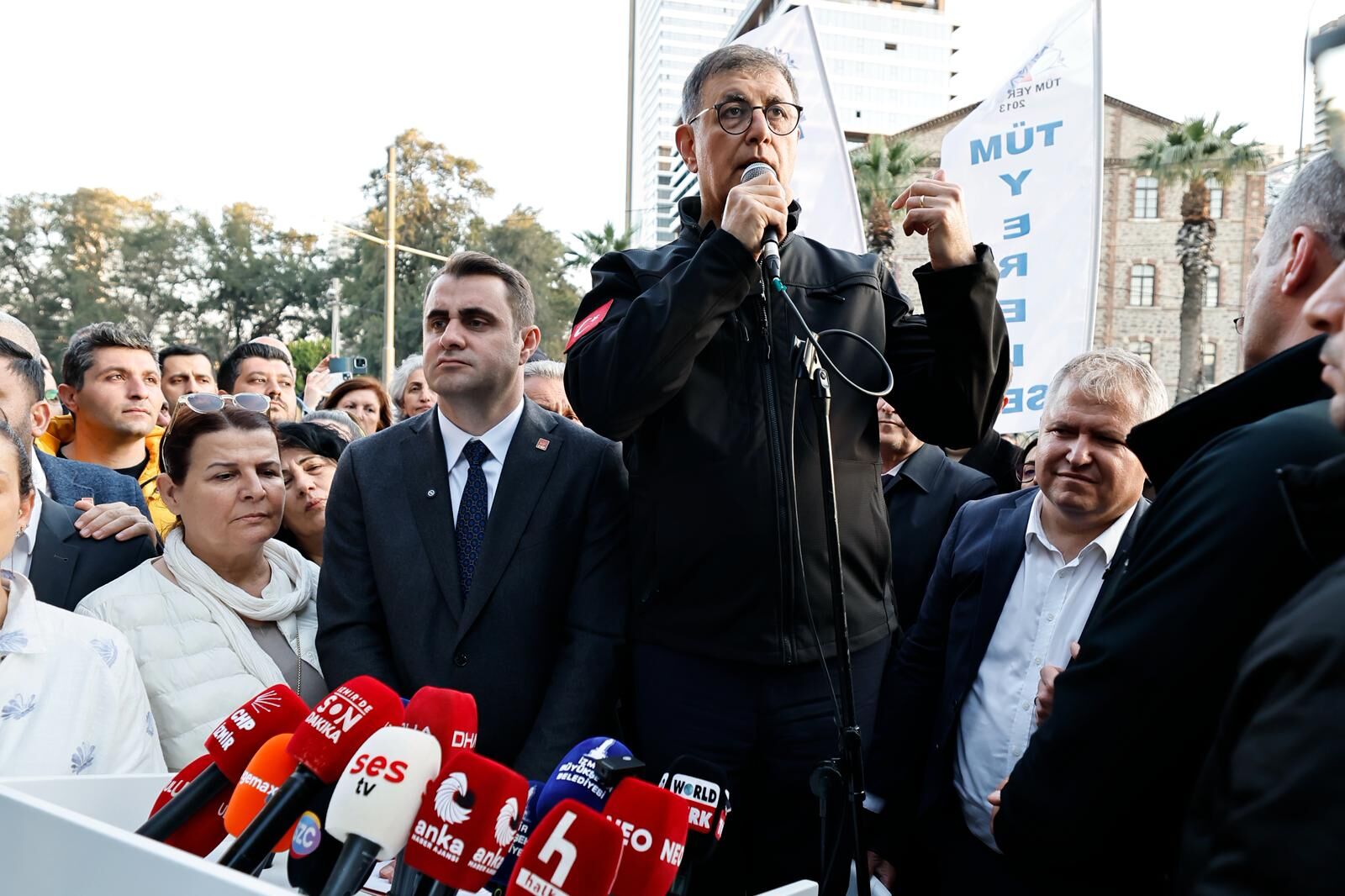 Tahliye süreci sırasında bina önünde kısa süreli arbede yaşanırken, alanda bulunan bazı kişiler “Başkan Tugay yalnız değildir” sloganları attı.