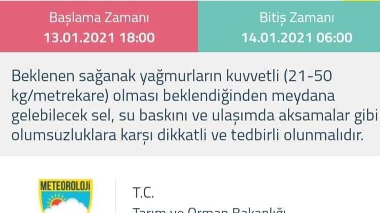 Meteoroloji Genel Müdürlüğünden yapılan uyarıda, bugün akşam saatlerinden itibaren etkili olacak yağışların, yarın akşam saatlerine kadar etkili olacağı bildirildi. Aşırı yağışlara karşı dikkatli olunması gerektiğine dikkat çekilen uyarıda, “Beklenen sağanak yağmurların, metrekareye 21-50 kilogram olarak düşmesi beklendiğinden, meydana gelebilecek sel, su baskını ve ulaşımda aksamalar gibi olumsuzluklara karşı dikkatli ve tedbirli olunmalıdır” ifadelerine yer verildi.