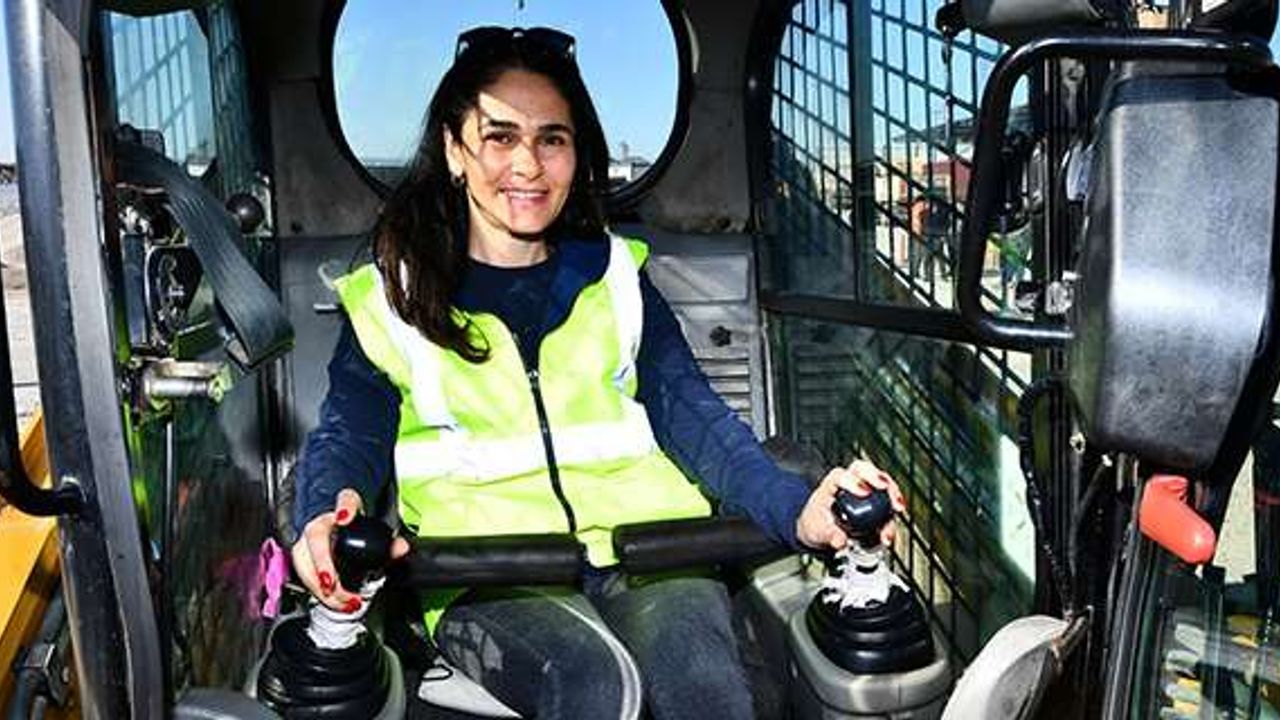 İlknur Özyalçın, Fen İşleri Şantiye Şube Müdürlüğü bünyesindeki kaldırım ve yol altyapı malzemeleri serim işinde 'mini loader' ve kepçe operatörü olarak çalışıyor.
