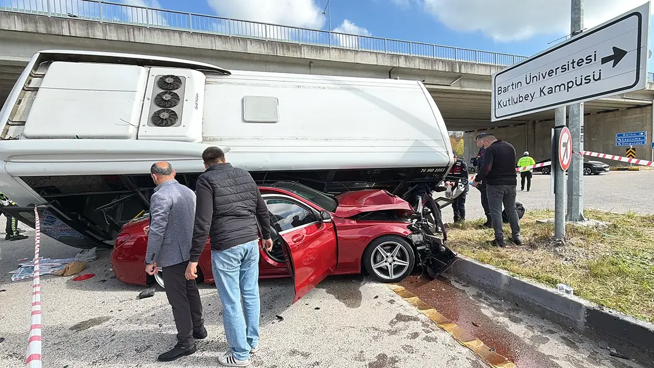 Kaza, saat 08.30 sıralarında Bartın-Ankara kara yolu Bartın Üniversitesi Kutlubey Yazıcılar kampüsü önünde meydana geldi. Kent merkezinden Bartın Üniversitesi’ne öğrenci taşıyan H.K. yönetimindeki 74 HO 1053 özel halk otobüsü, viyadüğün altındaki kavşaktan dönerken yan yoldan gelen İ.Ç yönetimindeki 06 FEB 298 plakalı otomobilin üzerine devrildi. Kazada sürücülerle özel halk otobüsünde bulunan 44 öğrenci hafif yaralandı. İhbar üzerine kaza yerine çok sayıda ambulans ve polis ekibi sevk edildi.