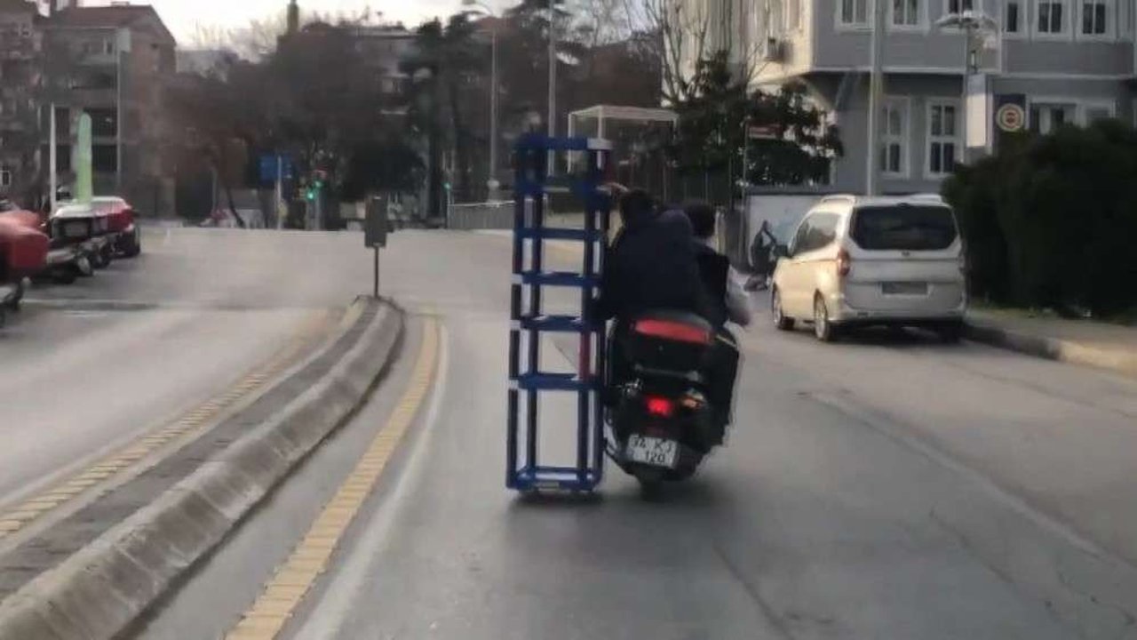 Olay, sokağa çıkma kısıtlamasının uygulandığı Pazar günü Kadıköy Recep Peker Caddesi üzerinde meydana geldi. Bir motosiklet üzerinde seyir halinde olan kasksız iki kişiden arkada duran şahıs yanlarına aldıkları yaklaşık 2 metre uzunluğundaki tekerlekli raf standını iki eliyle tutup, sürüyerek taşımaya çalıştı. Öte yandan, motor sürücüsünün ve arkasındaki şahsın maske ve sosyal mesafe kurallarına uymadıkları görüldü.