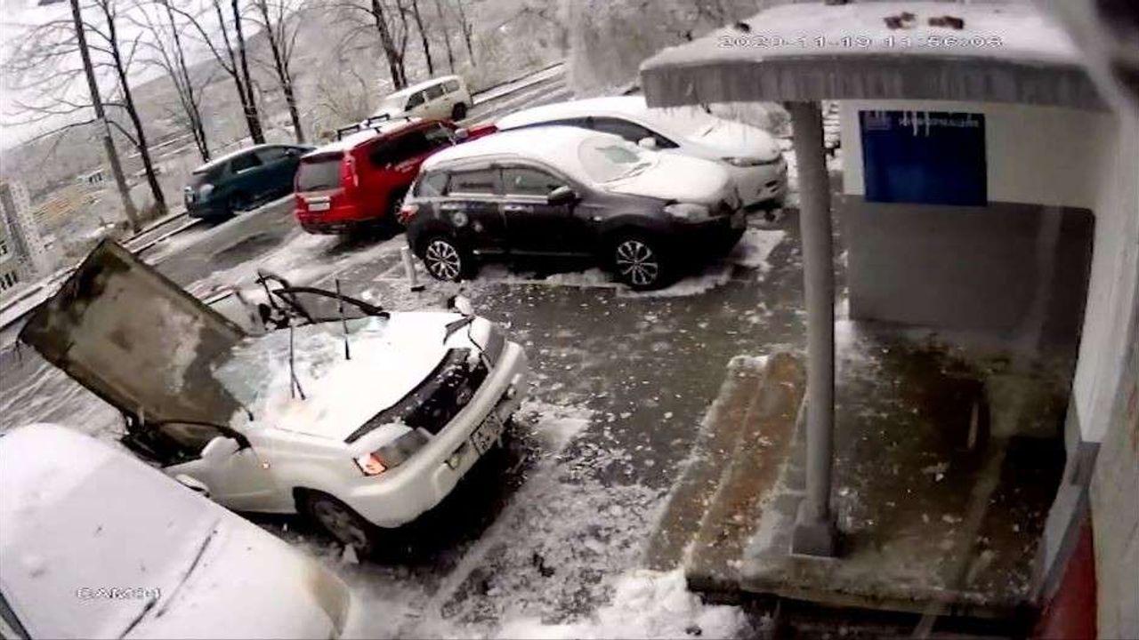 Rusya’nın Vladivostok şehrinde gece saatlerinde başlayan aşırı tipi ve kar yağışı nedeni ile kentin belli bölgelerinde günlük hayat olumsuz etkilenirken, pek çok araba kar altında kaldı. Sabah saatlerinde, kimliği açıklanmayan bir adam evinin önünde park halinde duran otomobilinin üzerindeki karı temizlemeye indi. Arabasını temizlerken bir süre sonra yukarıdan sesler geldiğini fark eden adam, binanın çatısından kopan büyük beton parçasını görerek geriye çekildi. Adam ezilmekten son anda kurtulurken, beton parçası arabasının üzerine düştü. Araç, darbenin etkisiyle neredeyse ortadan ikiye ayrılarak kullanılmaz hale geldi.