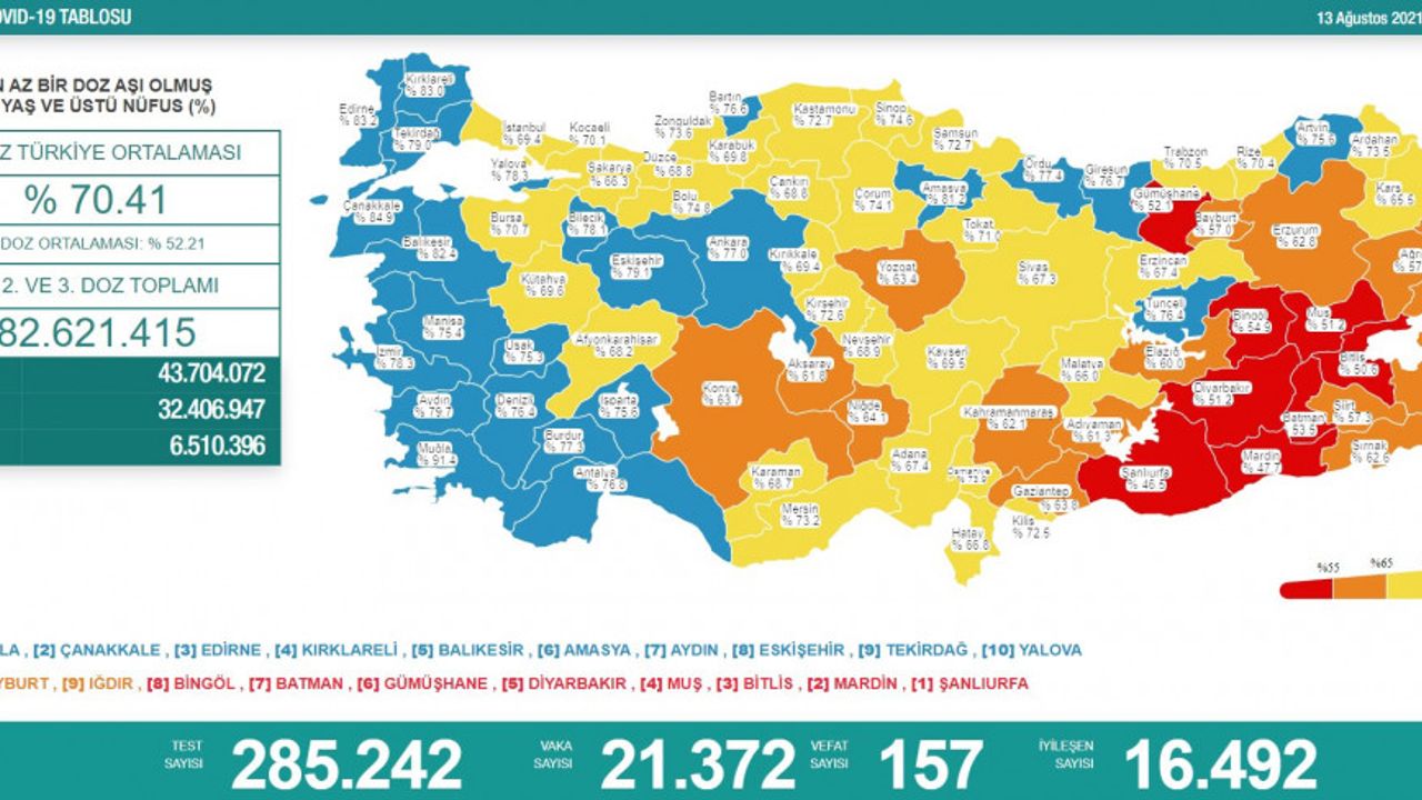 En az bir doz aşı olmuş 18 yaş ve üzeri nüfus verilerinde 1'inci doz Türkiye ortalaması yüzde 70,41, 2'nci doz ortalaması yüzde 52,21 olarak ölçüldü. Ayrıca, 1'inci dozda 43 milyon 704 bin 72, 2'nci dozda 32 milyon 406 bin 947 ve 3'üncü dozda 6 milyon 510 bin 396 olmak üzere toplam 82 milyon 621 bin 415 aşı uygulandı.