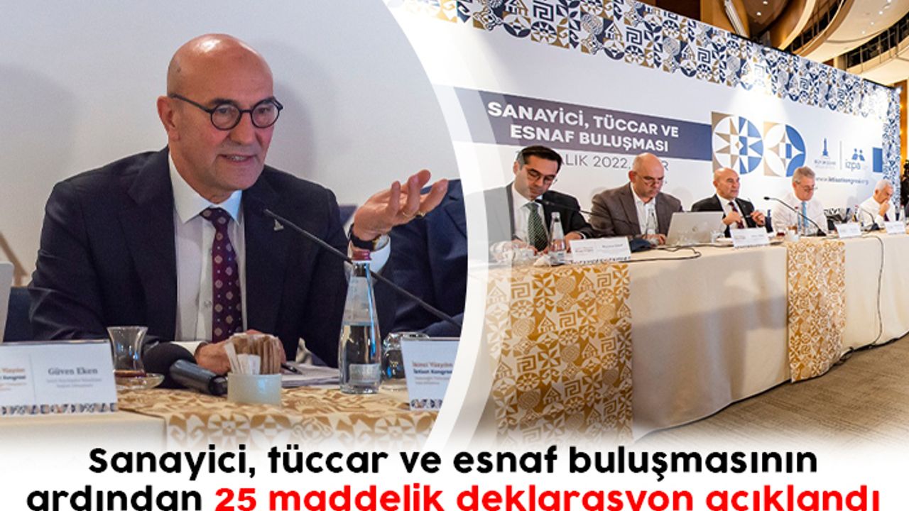 İzmir Büyükşehir Belediyesi tarafından “Geleceğin Türkiyesi’ni inşa ediyoruz” sloganıyla Şubat 2023’te İzmir’de düzenlenecek İkinci Yüzyılın İktisat Kongresi hazırlık çalışmaları kapsamında yapılan son paydaş buluşmasının ardından sonuç bildirgesi açıklandı. İzmir Büyükşehir Belediye Başkanı Tunç Soyer, sanayi, ticaret ve esnaf odalarının temsilcilerinin katıldığı Swissotel Büyük Efes’teki toplantının ardından 25 maddelik deklarasyonu kamuoyu ile paylaştı.
