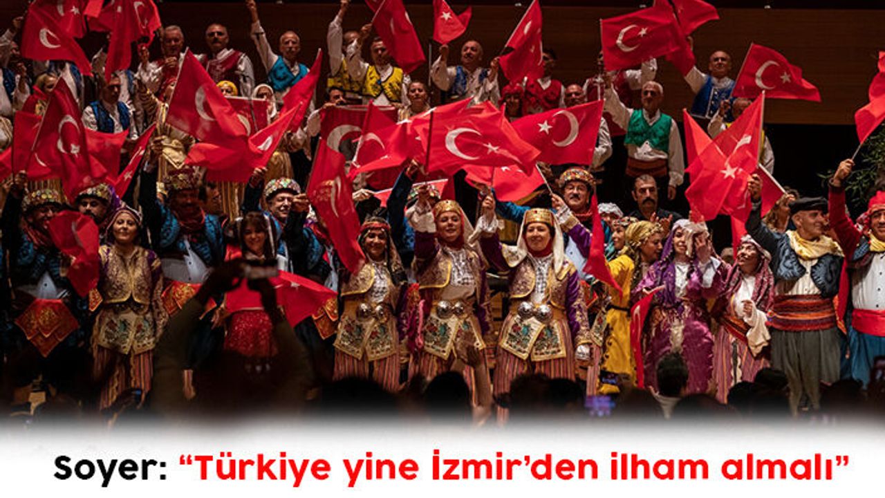 Tiyatro oyununu büyük bir beğeniyle izleyen Başkan Tunç Soyer, sahneye çıkarak muhtarları ve eğitmenleri tebrik etti. Başkan Soyer, “Bu kurtuluş destanı, olağanüstü güzel anlatıldı, tüylerimiz diken diken oldu. Sizleri bu muazzam şov için tebrik ediyorum. Gerçekten muhtar arkadaşlarımın her biriyle iftihar ediyorum. İzmir’in Saat Kulesi gibi, körfezi gibi anlattığımız çok özel şeyleri vardır. Bundan anlatacak bir hikayemiz daha var; İzmir muhtarları. İzmir yine İzmirliliğini yaptı. Bu arkadaşların Türkiye’yi fethetmesi lazım. Arkadaşlarımızı turneye çıkarmamız lazım. Türkiye sizlerden ilham almalı. İzmir yine Türkiye’ye örnek olmalı. Bunu muhtarlarımız yapacak biliyorum. Bütün Türkiye’ye umut verecekler. Kurtuluş destanını yazanlar rahat uyusunlar. Arkalarından gelen muhtarlarımız sonuna kadar onların hatıralarına sahip çıkıyorlar” şeklinde konuştu.