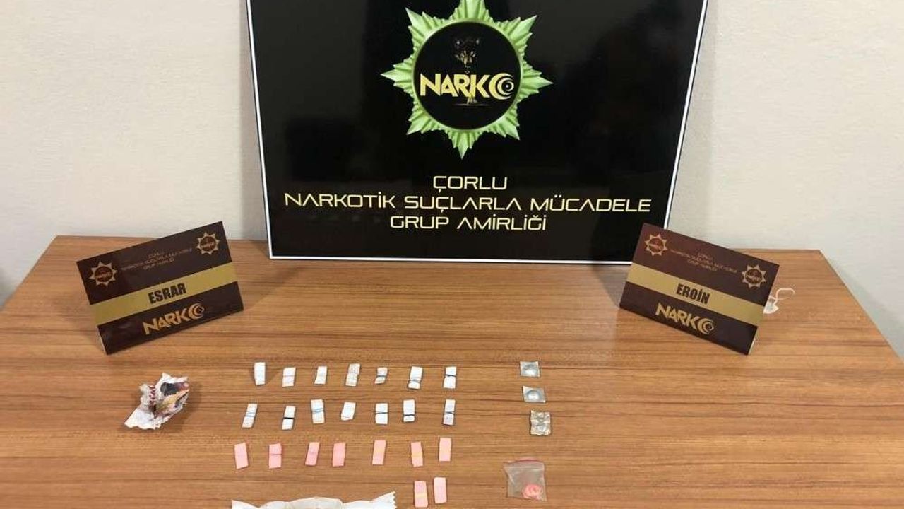 Tekirdağ İl Emniyet Müdürlüğü Narkotik Suçlarla Mücadele Şubesi Çorlu Grup Amirliği ekipleri, uyuşturucu madde kullanan şahıslara yönelik çalışma gerçekleştirdi. İlçeye bağlı Hıdırağa (Kore) Mahallesi’nde şüphe üzerine durdurulan bir araçta ve araçta bulunan şahısların üzerinde arama yapıldı. Aramalarda fişeklenmemiş halde daralı ağırlığı 2.5 gram olan eroin maddesi, 23 fişek eroin, 2 fişek sentetik kannabinoid (bonzai) maddesi, 4 adet reçeteye tabi hap ve kilitli poşet içerisinde uyuşturucu madde fişeklemesinde kullanılan lastik tokalar ele geçirildi. Araçta bulunan B.T. ve H.E. isimli şahıslar gözaltına alındı.