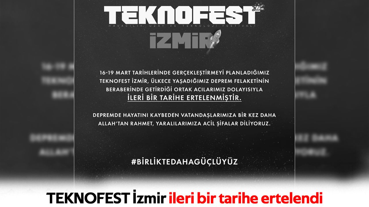 TEKNOFEST'in sosyal medya hesabından yapılan paylaşımda, "16-19 Mart tarihlerinde gerçekleştirmeyi planladığımız TEKNOFEST İZMİR, ülkece yaşadığımız deprem felaketinin beraberinde getirdiği ortak acılarımız dolayısıyla ileri bir tarihe ertelenmiştir. Depremde hayatını kaybeden vatandaşlarımıza bir kez daha Allah’tan rahmet, yaralılarımıza acil şifalar diliyoruz” denildi.