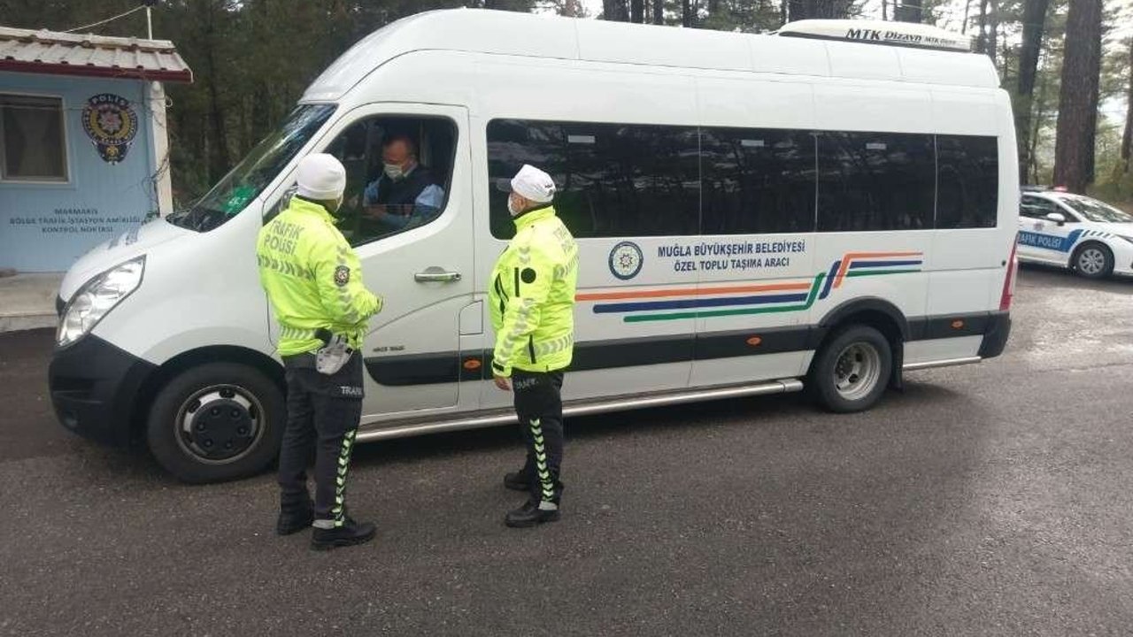 Korona virüse karşı alınan tedbirler kapsamında denetimlere hız verildi. Yılbaşı öncesi Marmaris’ten Akyaka istikametine giden toplu taşıma ve yük taşıyan araçlara Marmaris Bölge Trafik Denetleme istasyonu ekipleri tarafından Çetibeli Bölge trafik kontrol noktasında yolculara maske ve mesafe kontrolü yapılarak, uyarılarda bulunuldu.