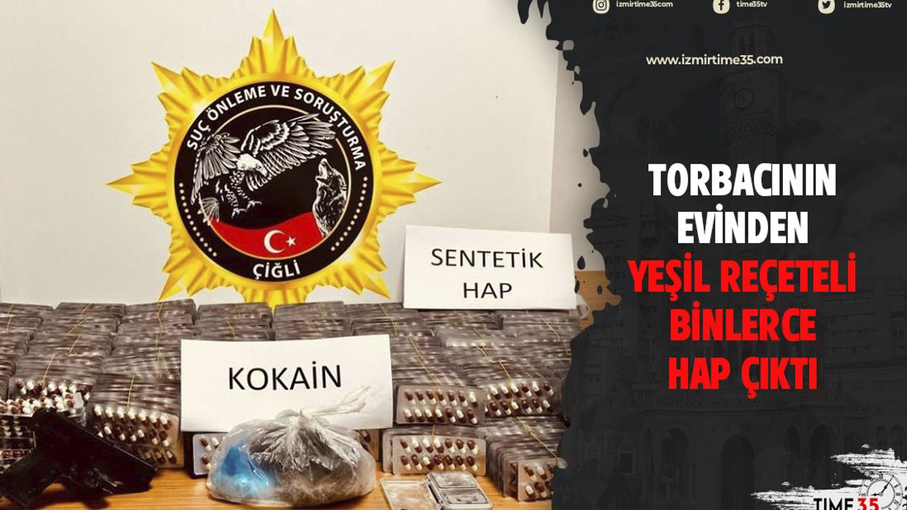İzmir'in Çiğli ilçesinde uyuşturucu tacirinin evine yapılan polis baskınında yeşil reçeteye tabi 13 bin 606 adet sentetik ecza ve 308 gram kokain ele geçirildi. Siparişleri bir deftere yazarak kayıt altına aldığı belirlenen şüpheli gözaltına alındı.