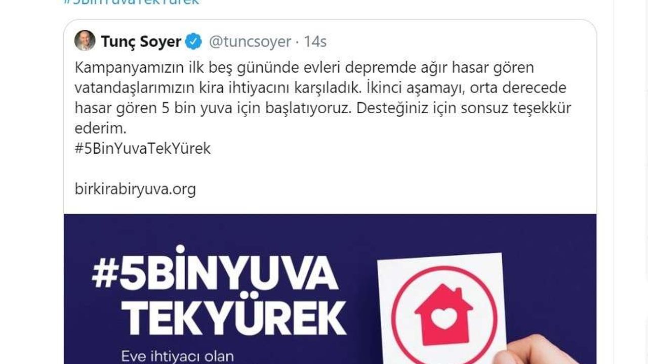 30 Ekim'deki İzmir depreminde evleri yıkılan veya hasar gören depremzedelere destek olmak için İzmir Büyükşehir Belediyesi tarafından yürütülen kampanya çalışmalarına bir destek de ünlü pop şarkıcısı Tarkan'dan geldi. Tarkan sosyal medya hesaplarından attığı 'Gelin hep birlikte İzmir'in yaralarını sarmaya, tek yürek olmaya devam edelim' mesajıyla tüm hayranlarını '5BinYuvaTekYürek' kampanyasına destek olmaya çağırdı. İzmir Büyükşehir Belediye Başkanı Tunç Soyer'in kampanya duyurusunu da paylaşan Tarkan'ın mesajı kısa sürede yüksek beğeni sayılarına ulaştı.