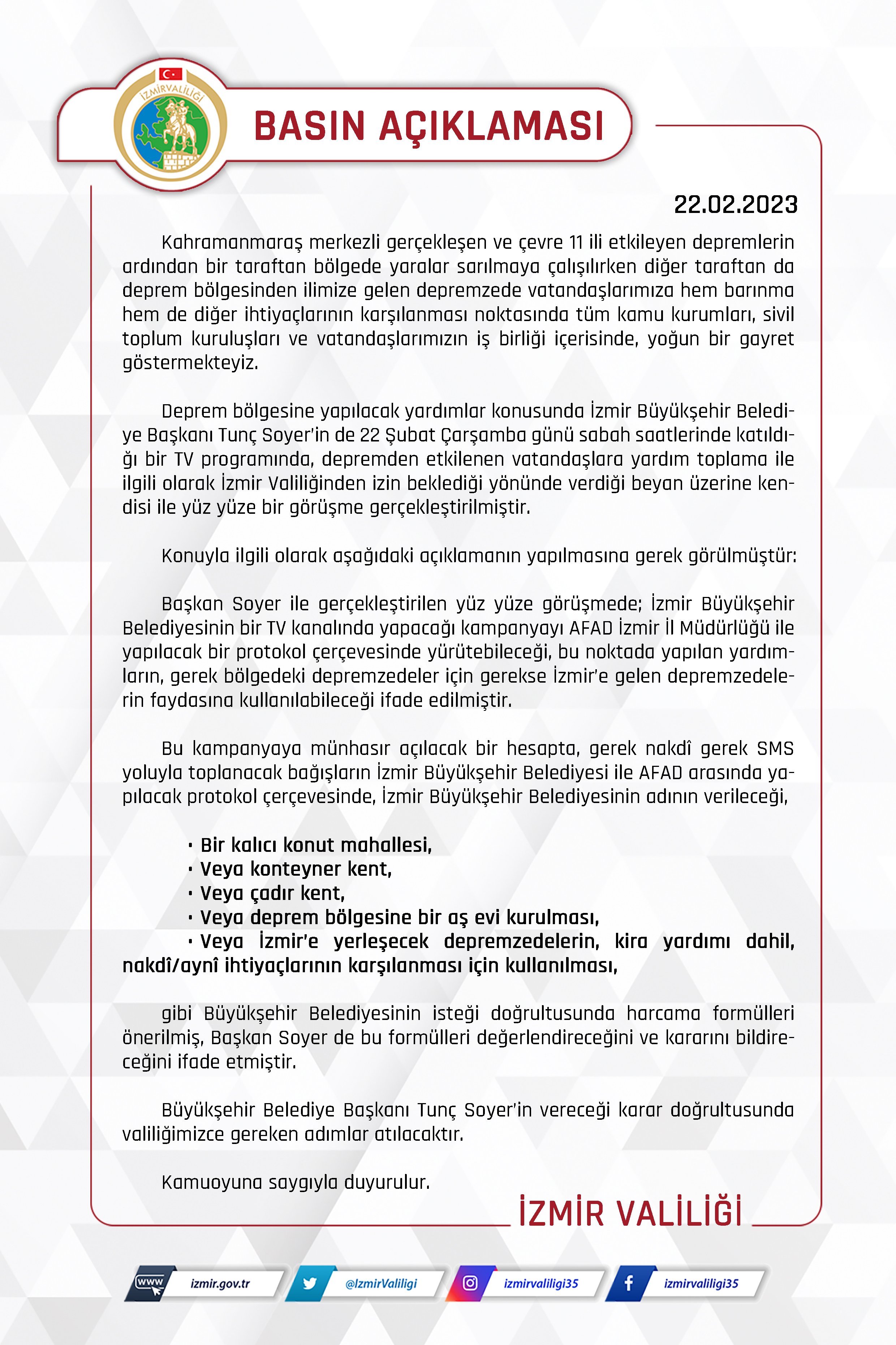 İzmir Valiliği'nin kamuoyu ile paylaştığı yazıda, depremzedeler için yapılacak olan bağış kampanyasının İzmir Büyükşehir Belediyesi ile AFAD arasında yapılacak protokol çerçevesinde olacağını bildirerek;