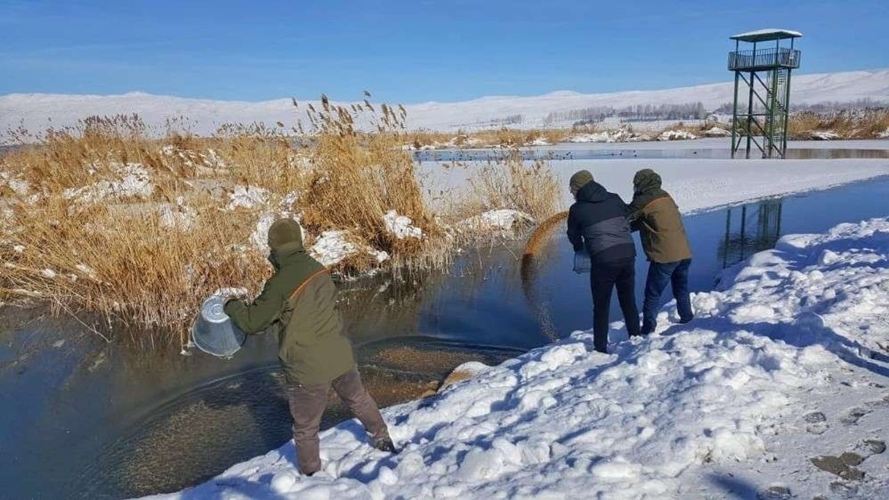 Van Doğa Koruma ve Milli Parklar İl Şube Müdürlüğü ekipleri, yüzlerce kuş türünün yaşadığı sulak alanlara kış şartları nedeniyle yiyecek bulmakta zorlanan yaban hayvanları için yem bırakıldı.