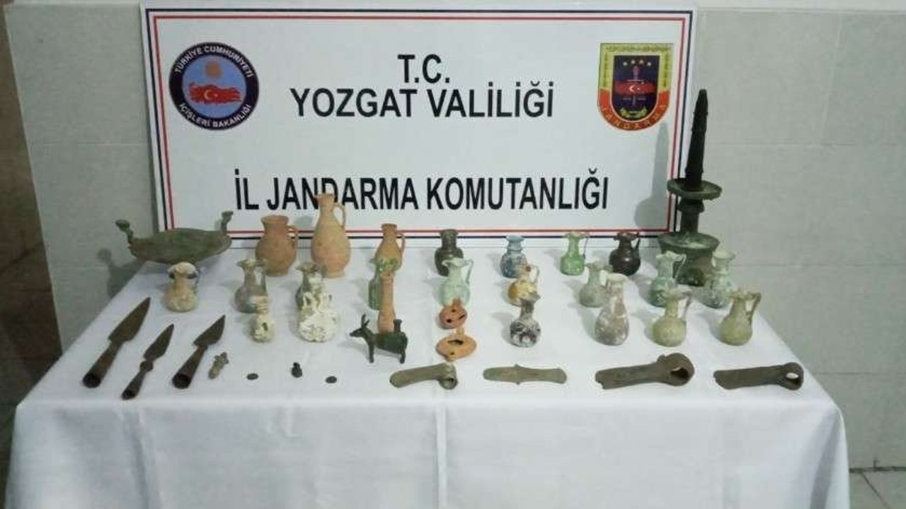 Yozgat İl Jandarma ekipleri, Akdağmadeni ilçesinde bir dinlenme tesisinde içerisinde tarihi eser olduğu ihbarını aldığı aracı durdurdu. Araç içerisinde yapılan aramada değişik dönemlere ait olduğu belirlenen 19 gözyaşı şişesi, 6 adet çömlek, 2 adet sikke, 1 mühür, 1 adet öküz heykeli, 1adet şamdan ve altlığı, 4 adet balta, 3 adet metal ok ucu ve bir adet figür olmak üzere 39 parça tarihi eseri ele geçirdi.